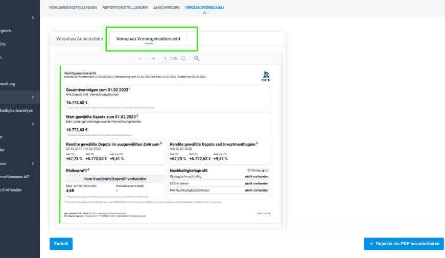 Nutzen: Mehr Sicherheit im Serienprozess: Die neue Vorschau zeigt das Anschreiben und die Vermögensübersicht in ihrer finalen Form – auf Basis von Musterkunde und Beispielportfolio. Berater:innen können damit gezielt kontrollieren, ob Inhalte und Layout stimmen, bevor der Seriendruck für eine ganze Kundengruppe ausgelöst wird.