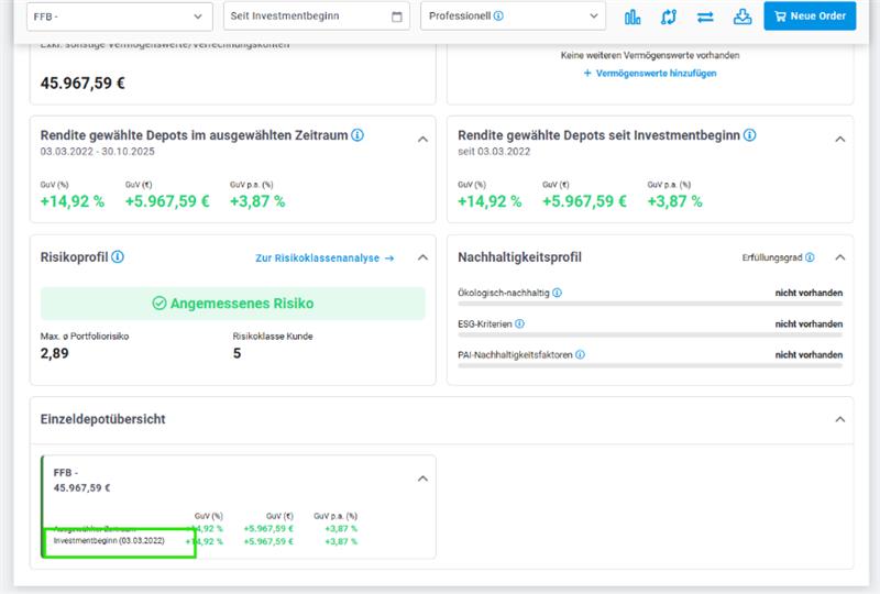 In der Einzeldepotübersicht wird nun direkt in jeder Depotkachel das konkrete Startdatum der Geldanlage angezeigt. Die bisherige Überschrift „Seit Investmentbeginn“ wurde durch „Investmentbeginn (dd.mm.yyyy)“ ersetzt. Nutzer sehen so auf einen Blick, wann genau die jeweilige Investition gestartet ist.